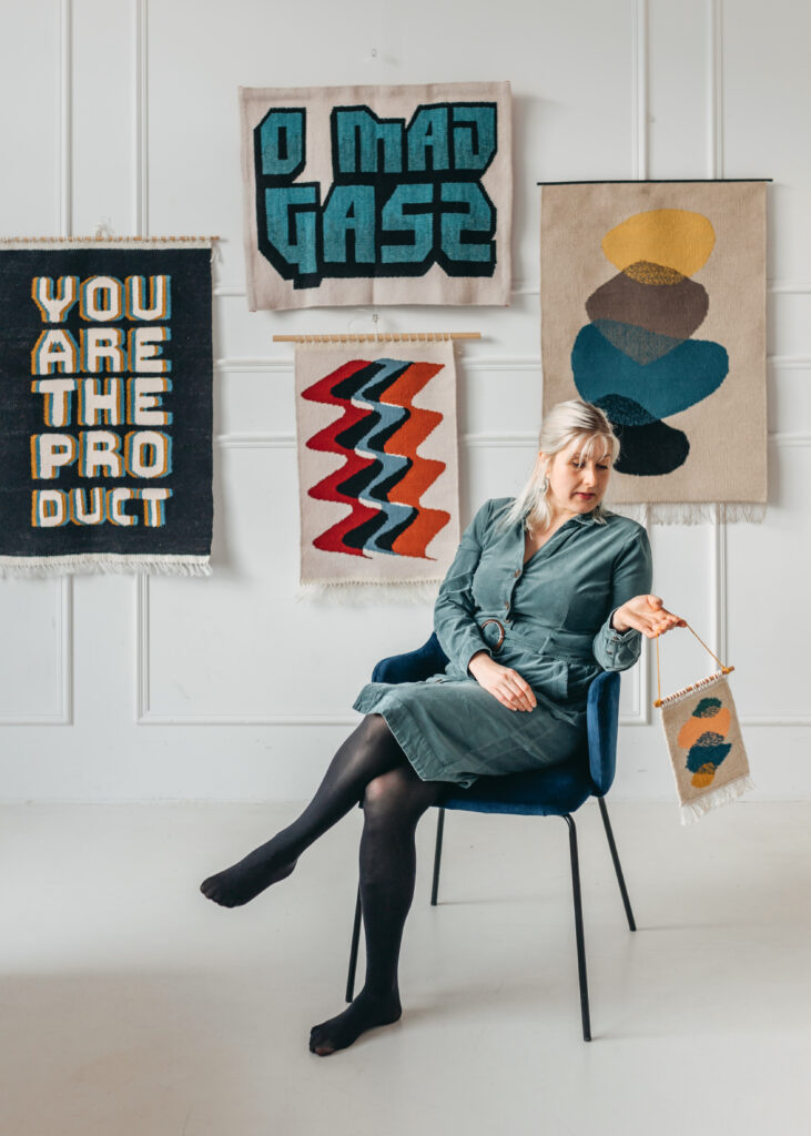 Druga część projektu, prezentowana w Galerii Tkackiej Na Jatkach, rozwija i poszerza wątki obecne w pierwszej odsłonie. Obok prac o charakterze dekoracyjnym pojawiają się realizacje o bardziej refleksyjnym i eksperymentalnym wymiarze. W strukturę tkaniny zostają wprowadzone teksty – niekiedy prowokujące – które zmieniają jej funkcję z czysto wizualnej na komunikacyjną. Splot staje się nośnikiem znaczeń, a sama tkanina zaczyna funkcjonować jako medium wypowiedzi.